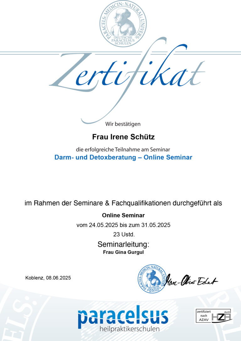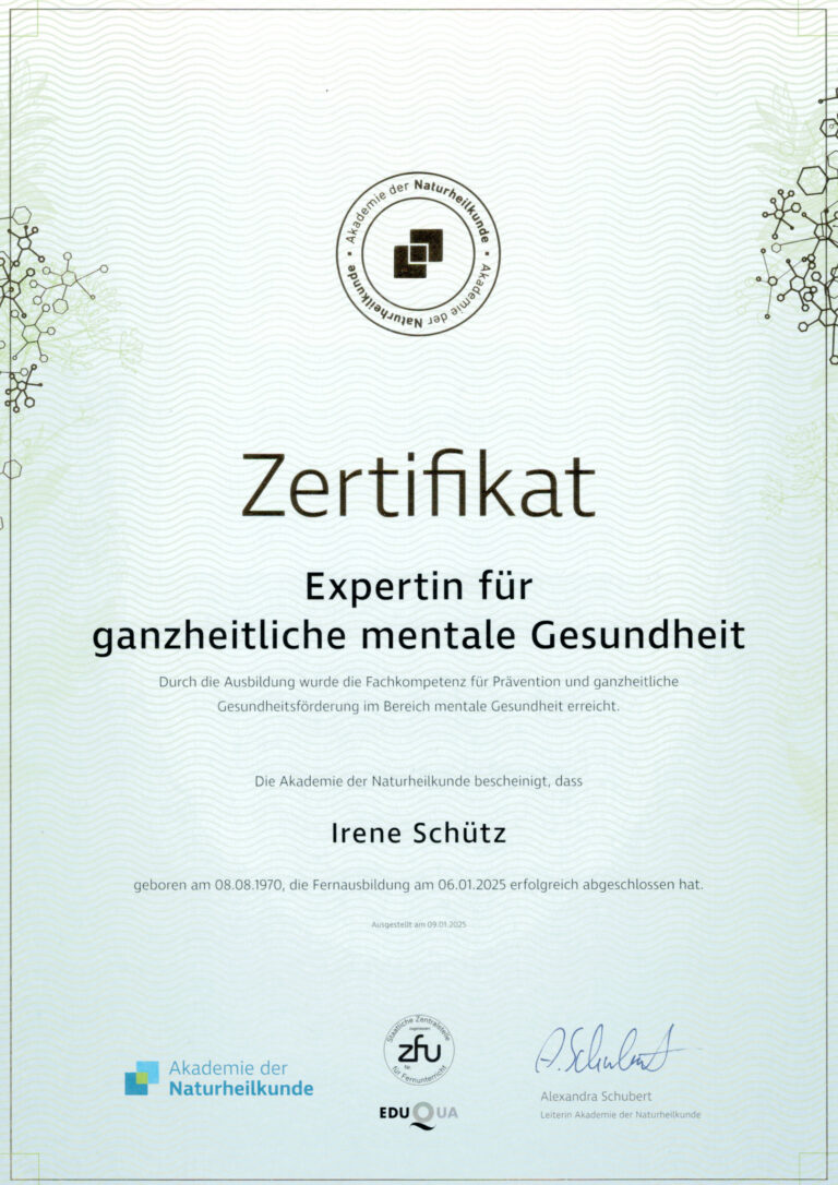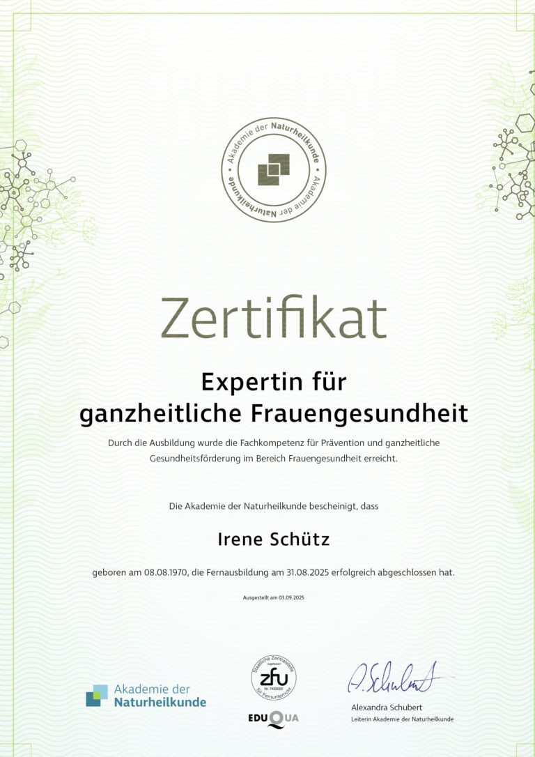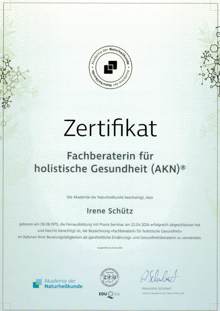 Seit ich mich entschied, mich vegan zu ernähren, sind Gesundheit und Ernährung Themen, die mich besonders interessieren. Im Jahr 2022 habe ich den Ausbildungslehrgang zur Fachberaterin für ganzheitliche Gesundheit / Ernährung begonnen und im Jahr 2024 abgeschlossen. Es folgten zwei weitere Ausbildungslehrgänge zur Expertin für mentale Gesundheit sowie zur Expertin für Frauengesundheit.